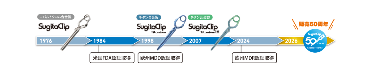 1998年 : 杉田クリップの材質をチタン合金とした「杉田チタンクリップ」が発売されました。チタン合金製のクリップへの改良は、MRI対応、生体適合性向上の点で臨床現場から高評価を受け、浸透していきました。 同年には欧州MDD認証を取得し、杉田クリップの販売エリアは欧州へも拡大しました。